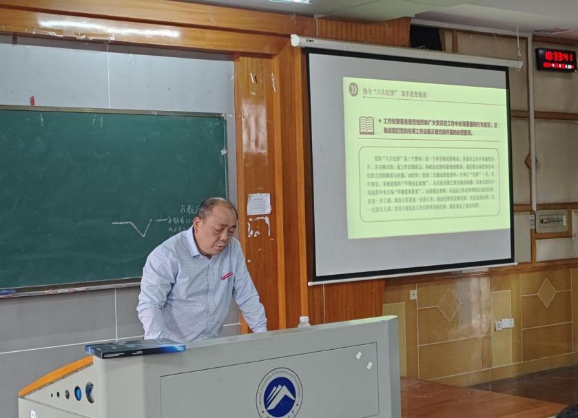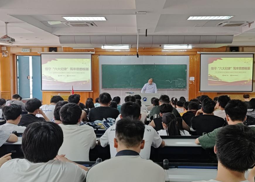 2024年6月6日,球王会体育党委书记万文以“恪守六大纪律,筑牢思想根基”为主题,在第五教学楼2-1教室为全院学生党员讲授专题纪律党课。