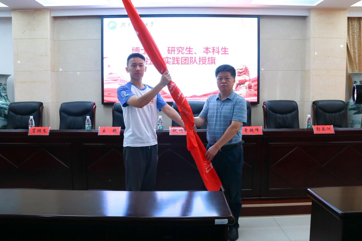 曾超峰讲话完毕后,由祝明桥依次为博士生、研究生、本科生志愿服务团代表授旗,各服务团代表接过队旗,也意味着接过“三下乡”的传承火炬。