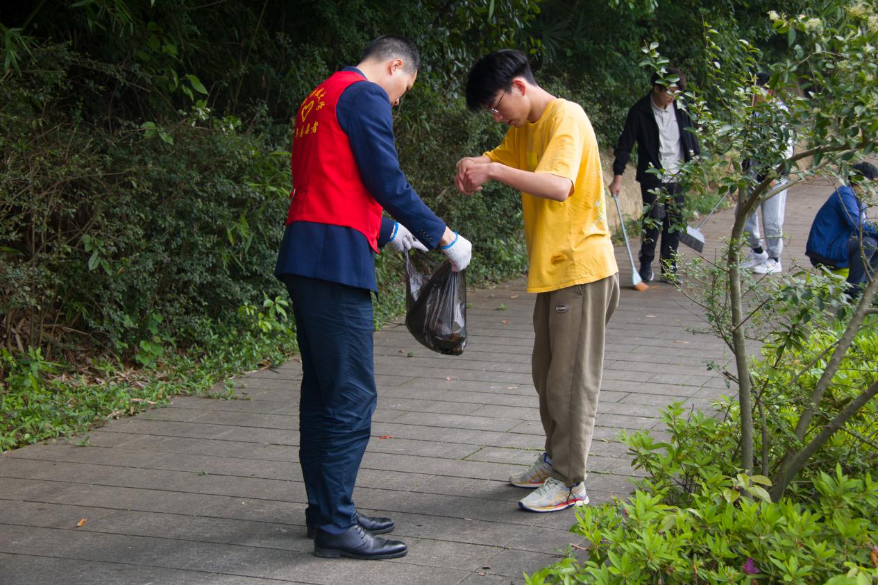 大家分为“不忘初心”“牢记使命”“砥砺前行”“勇于担当”四个小组,领取手套、口罩、塑料袋等劳动用品,带上劳动工具,在各组长的带领下进行卫生打扫活动进行美化校园活动,在劳动中体会青年的责任与担当。段思涵作为志愿者,感悟颇丰:“我们欣逢盛世,定当不负盛世。作为一名时代新青年,我将努力学习科学文化知识,用奋斗书写青春最靓丽的篇章。”